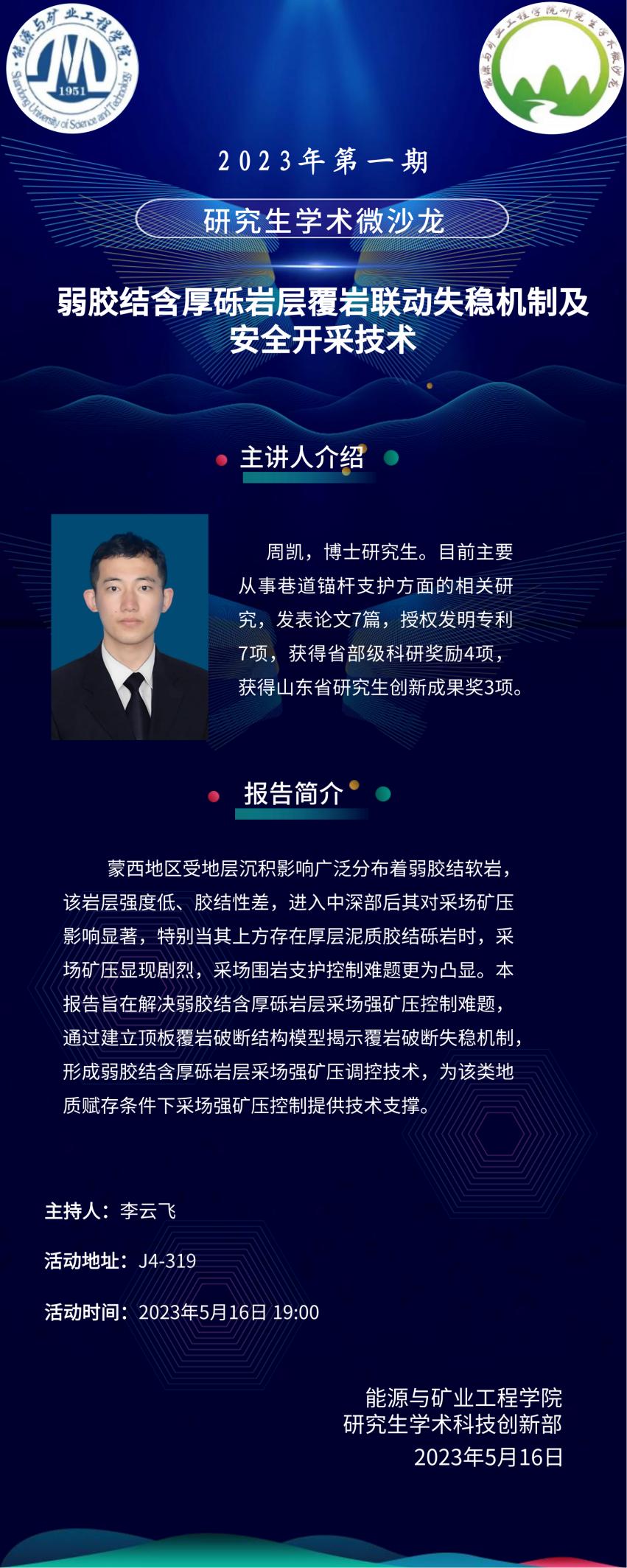 5月19日,由中文无码 主办,能源与矿业工程中文无码研究生会承办的2023年第1期研究生学术微沙龙“弱胶结含厚砾岩层覆岩联动失稳机制及安全开采技术”在J4-319成功举办。本次学术微沙龙活动由中文无码 博士研究生周凯作主题报告,中文无码研究相关方向的博士生和硕士生参加,活动由中文无码研究生会执行主席李云飞主持。