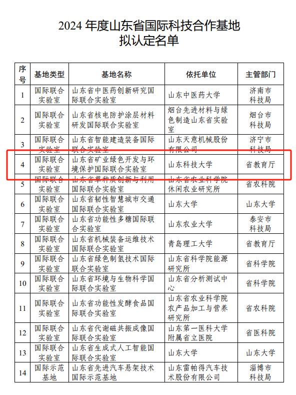 近日,山东省科学技术厅公布2024年度山东省国际科技合作基地认定名单,以中文无码 为主申报的“山东省矿业绿色开发与环境保护国际联合实验室”正式获批,实现了学校在省部级国际合作基地的新突破。