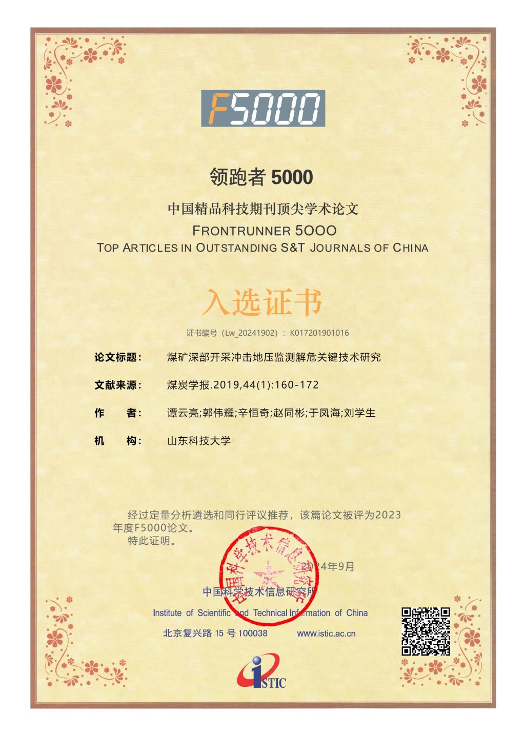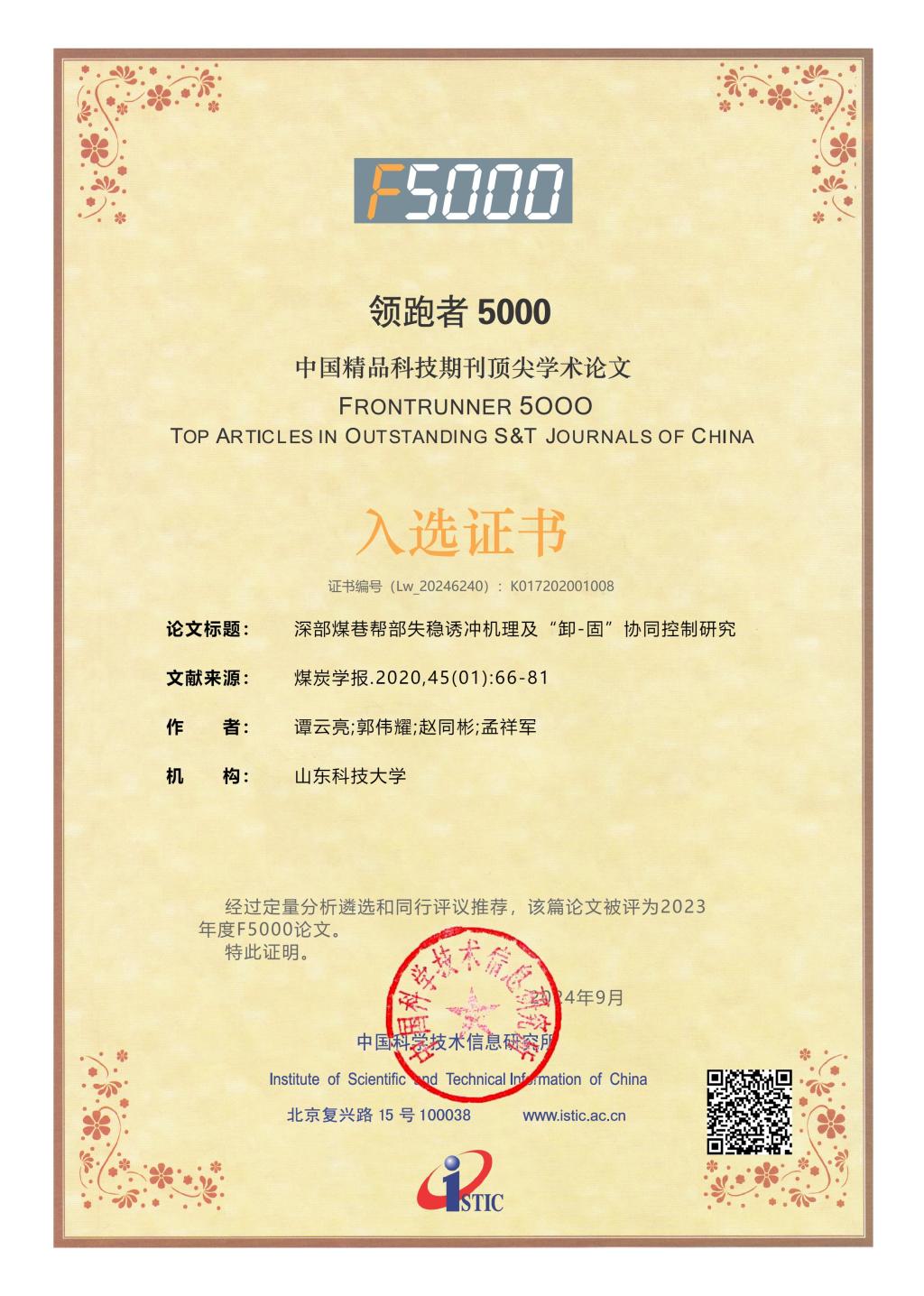 近日,科技部中国科学技术信息研究所发布了2023年度“领跑者5000—中国精品科技期刊顶尖学术论文(F5000)”入选论文名单。中文无码 谭云亮教授等在《煤炭学报》发表的“煤矿深部开采冲击地压监测解危关键技术研究”“深部煤巷帮部失稳诱冲机理及‘卸-固’协同控制研究”两篇论文,入选2023年度(2024年公布)F5000论文。