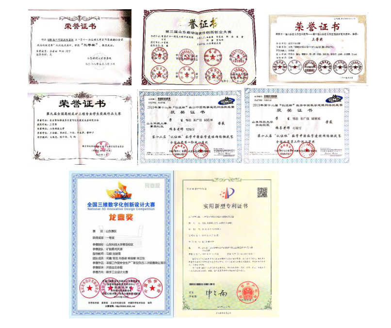 除了平时的学习工作外,作为一个工科生要积极参与各类科技创新比赛,对我而言比赛不必过于在意结果,当你付出足够多的时间精力之后,自然而然就能获得满意的结果。比赛的过程非常重要,不仅锻炼一个人的创新能力、时间规划能力,还锻炼了一个人的抗压能力以及查找资料的能力。这些能力都是课堂上老师教不了的,需要自己的探索。当然一开始做比赛是最困难的,这时候最好能加入到学长学姐的队伍里从中学习,等到自己熟悉比赛的基本流程之后,再开始自己的比赛。大学三年我也一直在尝试,期间也获得了一些奖项,包括认证杯数学建模网络挑战赛第一阶段二等奖、第二阶段一等奖,第九届全国高校采矿工程专业学生实践作品大赛三等奖,第三届山东新动能软件创新创业大赛二等奖,全国三维数字化创新设计大赛山东赛区一等奖、第十届山东省大学生创业计划大赛一等奖一项、三等奖一项,节能减排大赛校级三等奖,华为杯一等奖,申请实用新型专利一项(一种可控节理式类岩石浇铸模具装置)。