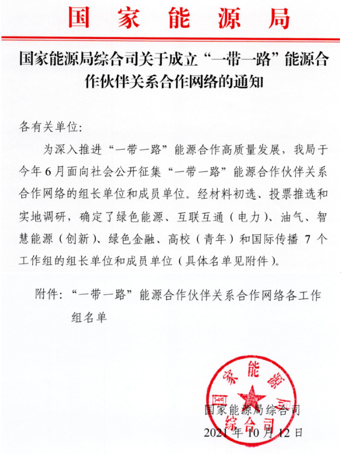 “一带一路”能源合作伙伴关系是2019年4月在第二届“一带一路”高峰论坛期间,由中国与29个国家共同发起成立,自成立以来,组织了一系列项目对接和技术交流活动,取得积极成效。伙伴关系合作网络是“一带一路”能源合作伙伴关系的重要组成部分,经材料初选、投票推选和实地调研,最终确定了绿色能源、互联互通(电力)、油气、智慧能源(创新)、绿色金融、高校(青年)和国际传播7个工作组。