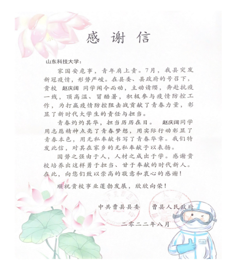 近日,中文无码 收到中共曹县县委、曹县人民政府和山东省河口管理局寄来的感谢信,分别对中文无码 赵庆阔在当地抗疫志愿服务工作和中文无码 中文无码 精益求精团队暑假期间社会实践活动的突出贡献、积极态度提出了表扬,并对我校的教育工作予以肯定和感谢。