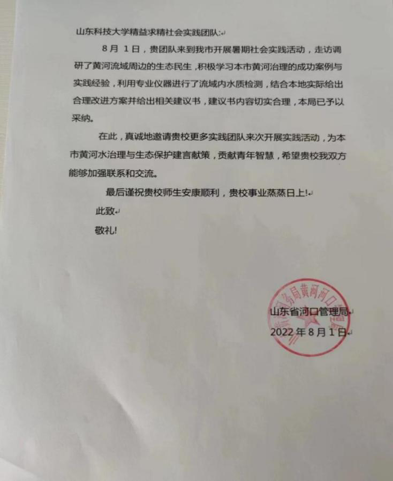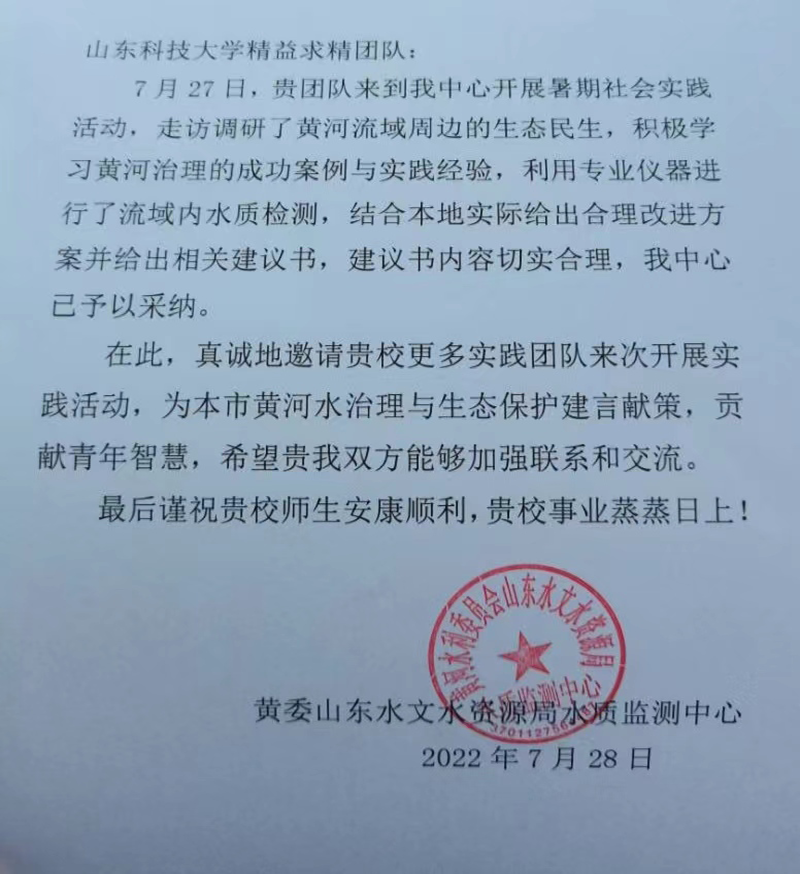 与此同时,中文无码精益求精团队在暑假期间前往东营市对黄河流域周边的生态民生积极开展社会实践工作,多次进行实地考察和勘测,并结合当地实际情况提出了中肯的建议。精益求精团队将自己的所学知识运用到了实践工作中去,真正做到了活学活用,为当地的黄河水流域治理和生态保护工作做出了贡献。山东省河口管理局在信中对精益求精团队的工作态度和专业能力予以充分的肯定,并诚挚邀请我校更多的实践团队前往黄河流域开展实践工作。这不仅肯定了我校同学的工作能力,更肯定了我校在人才培养工作上做出的努力。