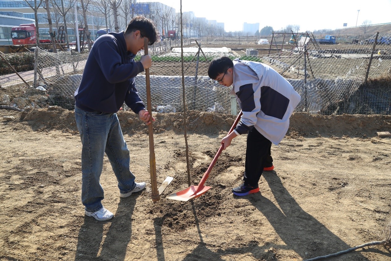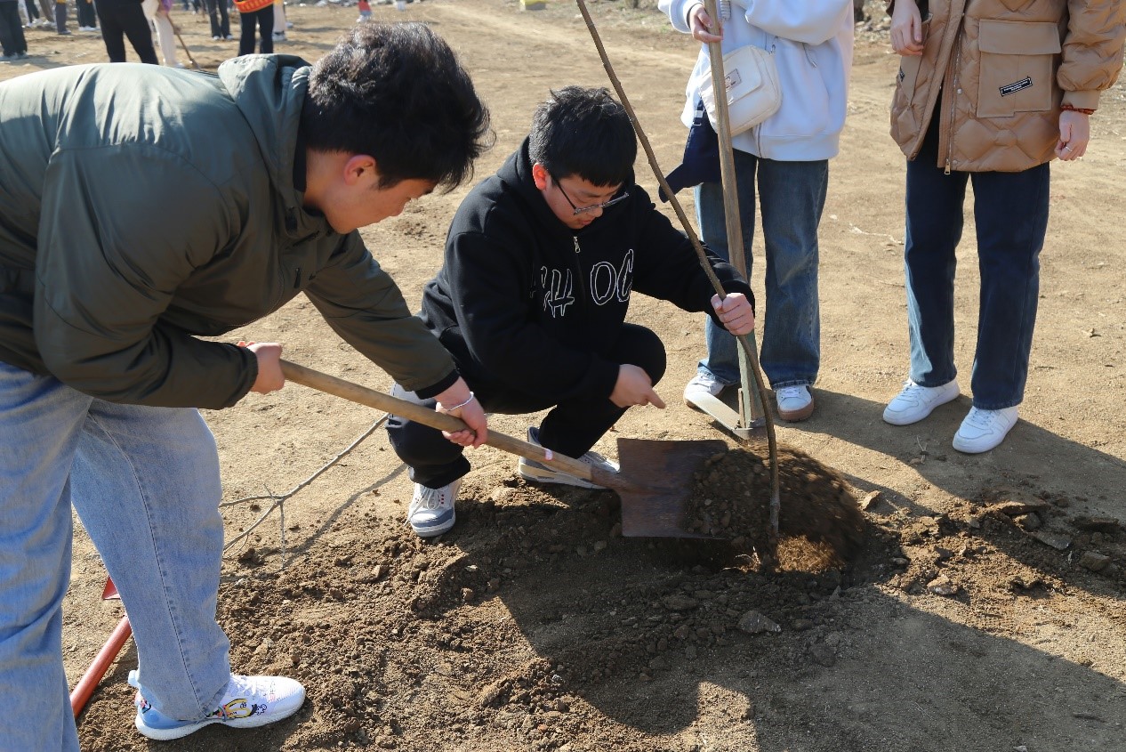 工作人员向志愿者们讲解了活动流程、注意事项,并给大家分发了劳动工具。种植现场,三人一组,五人一群,23名能源学子互相配合,通过挥锹铲土、扶树填土、培土浇水等一系列步骤,合力将杨树苗种入土壤中。志愿者们衔接有序、默契配合,现场呈现出一片热火朝天的劳动景象。工程力学2023-1班林雨桐说:“参加义务植树是每个适龄公民的法定义务,以后我还会继续参加这样的志愿活动,为‘绿水青山就是金山银山’贡献一份青春力量。