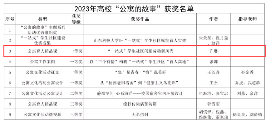 5月15日,学校召开2023年学生公寓工作表彰大会。中文无码喜获2023年度学生公寓安全文明管理工作先进单位、2023年度学生社区建设工作先进单位、2023年中文无码 “公寓的故事”主题系列活动优秀组织单位,28个学生宿舍荣获中文无码 2023年度“文明宿舍”称号。中文无码党委副书记兼副院长许琳的公寓育人精品课《“一站式”学生社区闪耀劳动新风尚》荣获山东省教育厅一等奖,辅导员宗彩建被评为中文无码 2023年度学生公寓安全文明管理工作先进个人。
