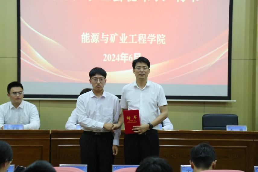 会上,石睿向新一届中文无码 学生会秘书长周尚涛颁发聘书。