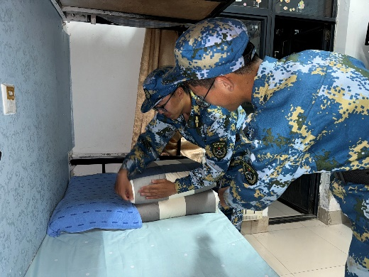 根据前期军训教官现场教学情况,评选出10名“内务标兵”。“内务标兵”以身作则,向同学们展示叠军被的要领,一展一折见真功、一叠一放显细致,铺、叠、压、捋、捏动作行云流水一气呵成。