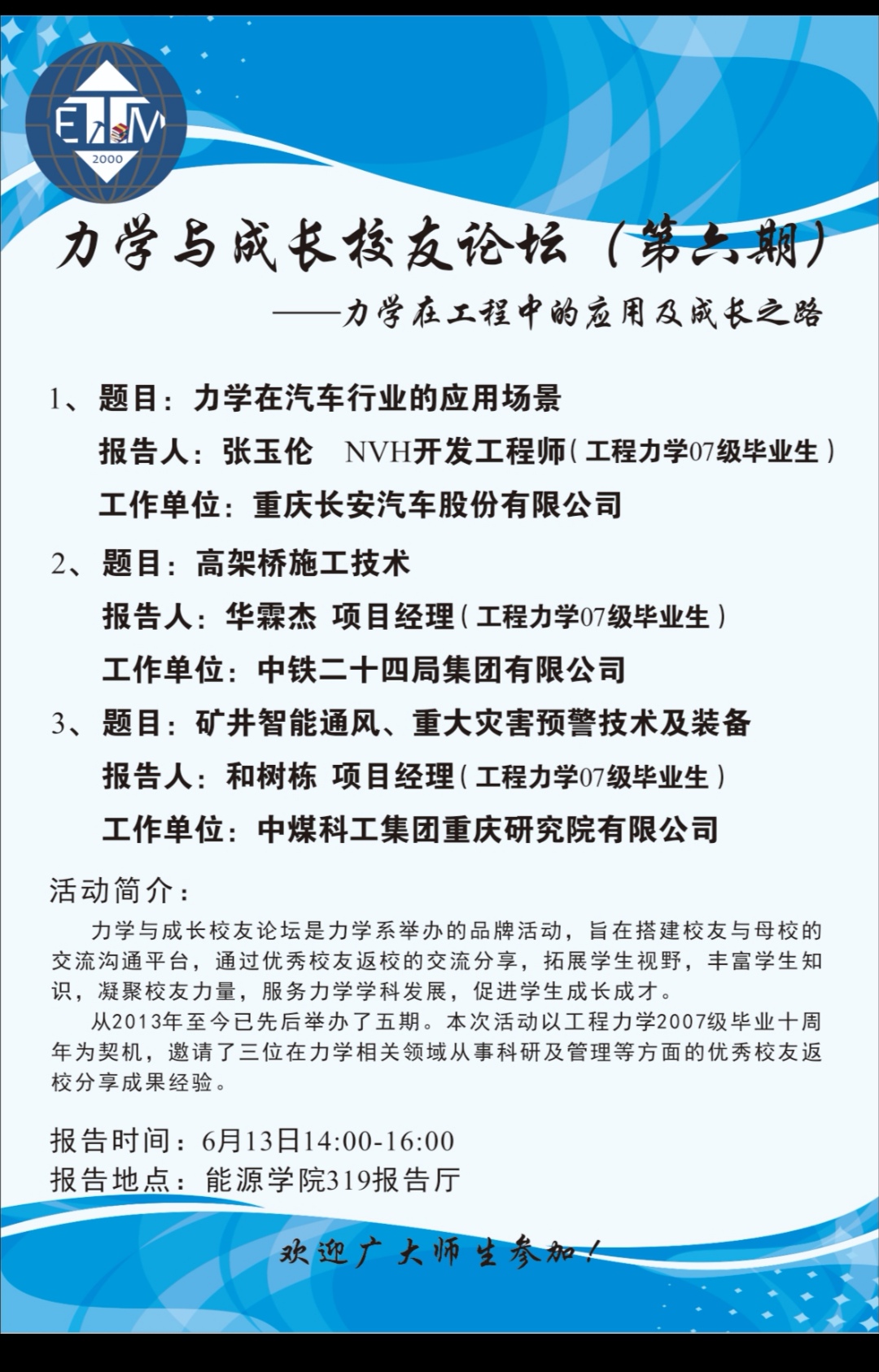力学与成长校友论坛(第六期)--力学在工程中的应用及成长之路